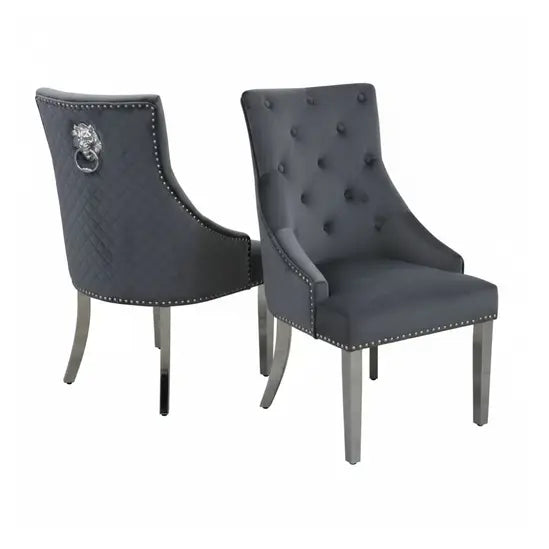esigned with sophistication and comfort in mind, this elegant velvet dining chair brings timeless glamour to any home interior. Featuring a beautifully quilted backrest, our knocker back dining chair is finished with a polished chrome lion-head ring and detailed studding along the borders, creating a refined designer look that complements both modern and classic décor styles. Perfectly paired with any of our dining tables, it’s a stunning addition to your home. The ergonomic high backrest offers superb comfort and support, making it ideal for long dinners, family gatherings, or social evenings. The high-quality chrome legs — straight at the front and elegantly curved at the back (saber-style) — add strength, stability, and contemporary flair. Available in beige, cream, black, dark grey, light grey, and shimmer grey, the Bentley Velvet Dining Chair fits beautifully into any setting, from dining rooms and kitchens to living rooms, bedrooms, or salons. Product Details: Dimensions: Width 56cm x Height 103cm x Depth 72cm Box Dimensions: 83 x 56 x 71cm Box Weight: 21.70kg Premium High-Quality Material – UK Fire Resistant Tested Polished Steel Chrome Lion Knocker Studded Detailing Along Border of Chair Quilted Stitching Back Design High-Quality Chrome Straight Legs, Curved at Back